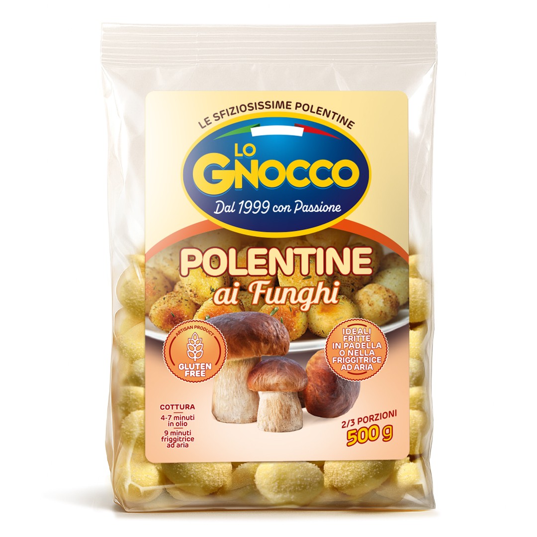 La polenta ai funghi è realizzata con l'aggiunta di funghi porcini per un sapore intenso e autentico. Pronta da cuocere in padella o in friggitrice ad aria, è perfetta per antipasti sfiziosi, contorni saporiti o snack rustici.